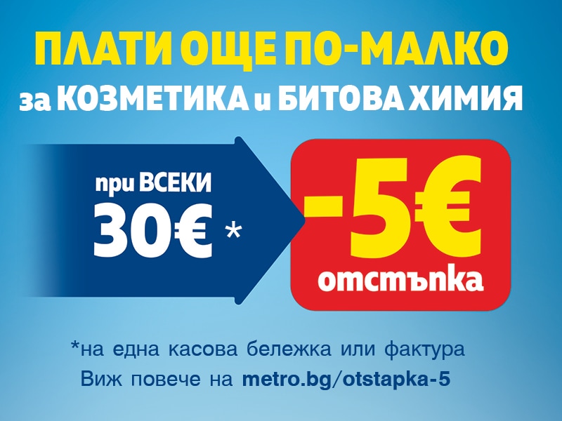 Плати по-малко за козметика и битова химия! Вземи 5 € / 9,78 лв. отстъпка още на касата за всеки 30 € / 58,67 лв. покупка от тези категории*.